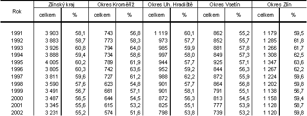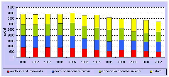 Za období let 1991 – 2002 pokračoval u mužů i u žen ve Zlínském kraji velmi příznivý vývoj úmrtnosti na nemoci oběhové soustavy. Počet úmrtí v roce 2002 byl ve srovnání s rokem 1991 nižší o 17,2 %. Nejvyšší četnosti dosáhl v roce 1995, kdy na nemoci oběhové soustavy zemřelo celkem 4 005 lidí. Jestliže v první polovině sledované časové řady se zastoupení této příčiny smrti na celkovém počtu úmrtí pohybovalo okolo 60 procent, v posledních pěti letech se přibližuje k 55 procentnímu podílu. I nadále jsou však úmrtí na nemoci oběhové soustavy jednoznačně na prvním místě v celkové úmrtnosti populace.