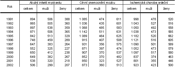 I přes pokračující demografické stárnutí obyvatelstva byl pokles intenzity úmrtnosti tak význačný, že se snižovala i hodnota hrubé míry úmrtnosti na nemoci oběhové soustavy. Od roku 1991, kdy činila 6,5 promile, poklesla v roce 2002 na 5,4 promile. Po nejvyšší zjištěné hodnotě hrubé míry úmrtnosti v roce 1995, docházelo již v podstatě k trvalému snižování počtu úmrtí na nemoci kardiovaskulárního systému připadajících na 1 000 obyvatel, s výjimkou roku 1997.