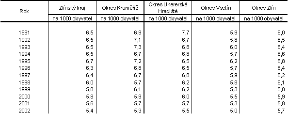 Vysoká úmrtnost na ICHS za období let 1991 – 2002 byla zjištěna v okresech Zlín a Vsetín (34,6 % a 34 % z celkového počtu úmrtí na nemoci oběhové soustavy). V okrese Kroměříž byl tento podíl nejnižší 17,2 %.