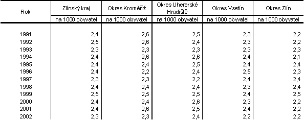 Hrubá míra úmrtnosti ve všech okresech Zlínského kraje dosahovala v letech 1991 až 2002 průměrné hodnoty 2,4 promile (okres Zlín 2,3 promile).
