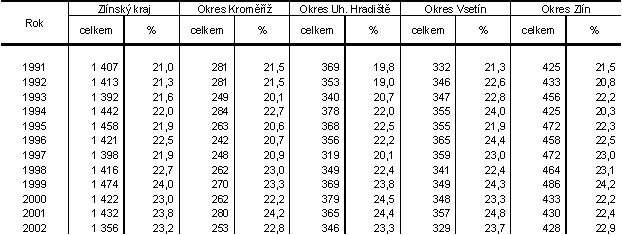 Tab. 22 Hrubá míra úmrtnosti na novotvary ve Zlínském kraji podle okresů za období 1991 – 2002