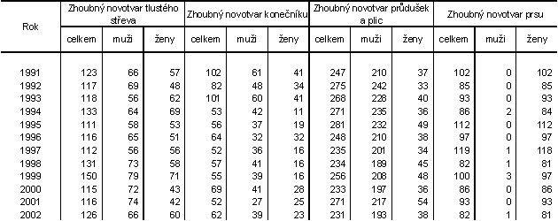 Tab. 23 Počet úmrtí na novotvary ve Zlínském kraji podle vybraných diagnóz za období 1991 – 2002