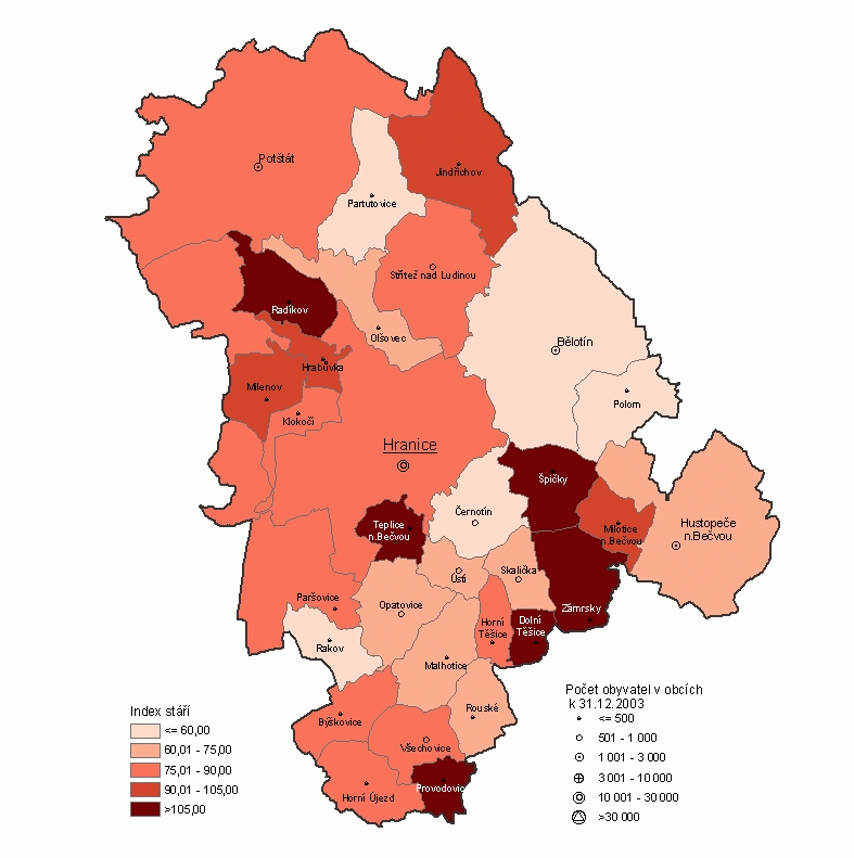 Kartogram: Index stáří obyvatel v obcích správního obvodu obce s rozšířenou působností Hranice (k 31. 12. 2003)