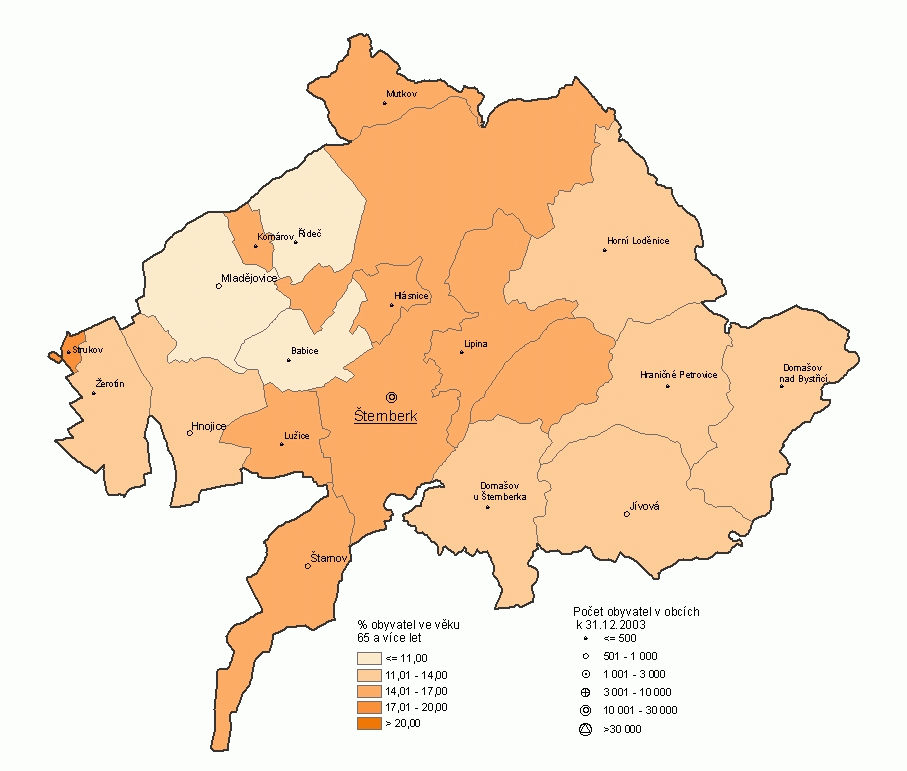 Kartogram: Podíl obyvatel ve věku 65 a více let v obcích správního obvodu obce s rozšířenou působností Šternberk (k 31. 12. 2003)