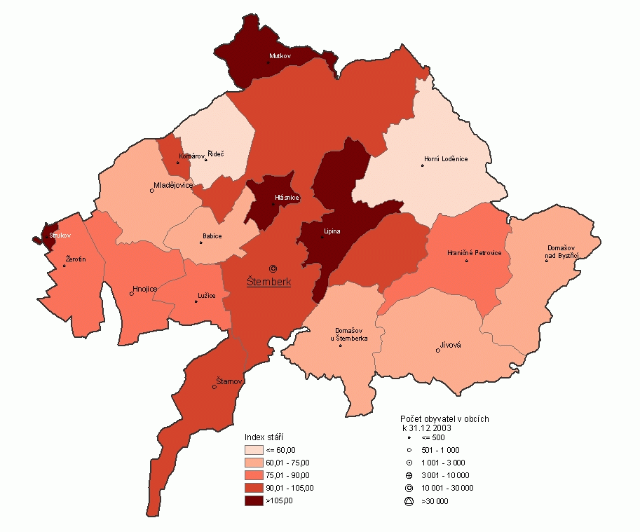 Kartogram: Index stáří obyvatel v obcích správního obvodu obce s rozšířenou působností Šternberk (k 31. 12. 2003)