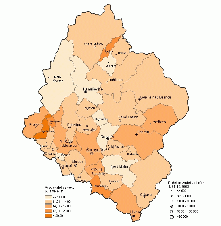 Kartogram: Podíl obyvatel ve věku 65 a více let v obcích správního obvodu obce s rozšířenou působností Šumperk (k 31. 12. 2003)