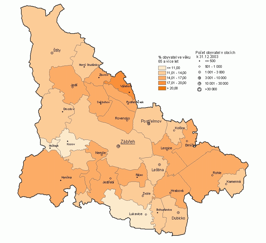 Podíl obyvatel ve věku 65 a více let v obcích správního obvodu obce s rozšířenou působností Zábřeh (k 31. 12. 2003)