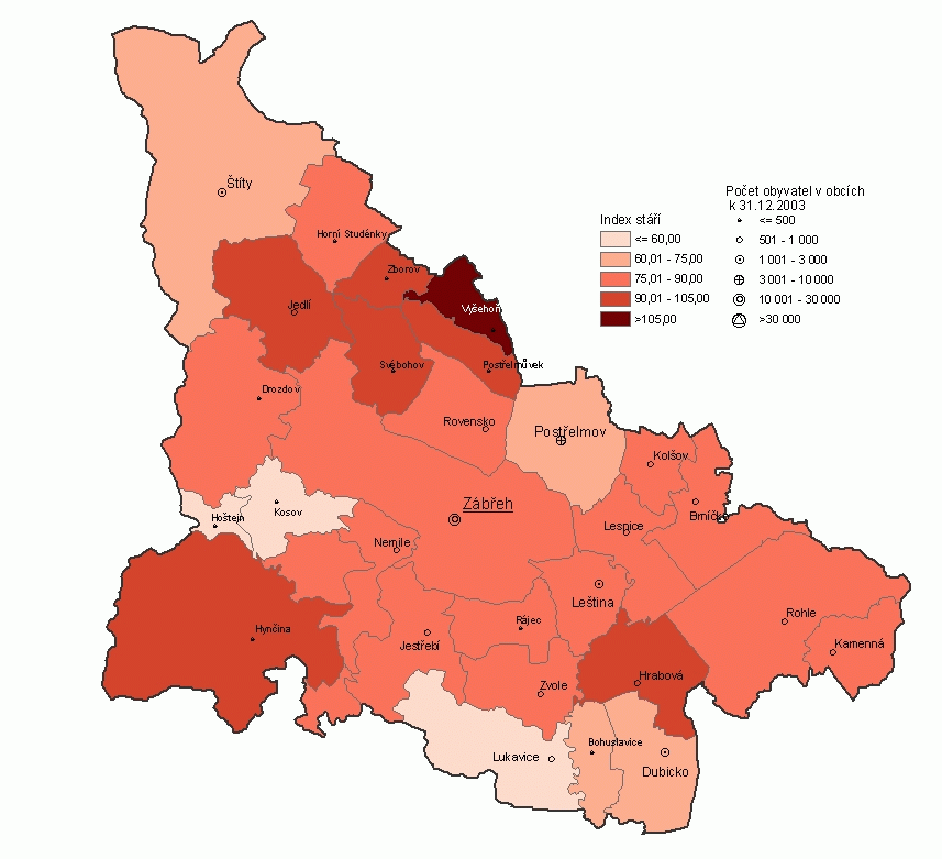 Kartogram: Index stáří obyvatel v obcích správního obvodu obce s rozšířenou působností Zábřeh (k 31. 12. 2003)