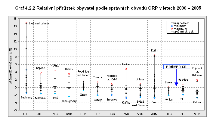 Graf 4.2.2 Relativní přírůstek obyvatel podle správních obvodů ORP v letech 2000 – 2005