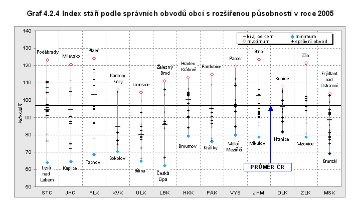Graf 4.2.4 Index stáří podle správních obvodů obcí s rozšířenou působností v roce 2005