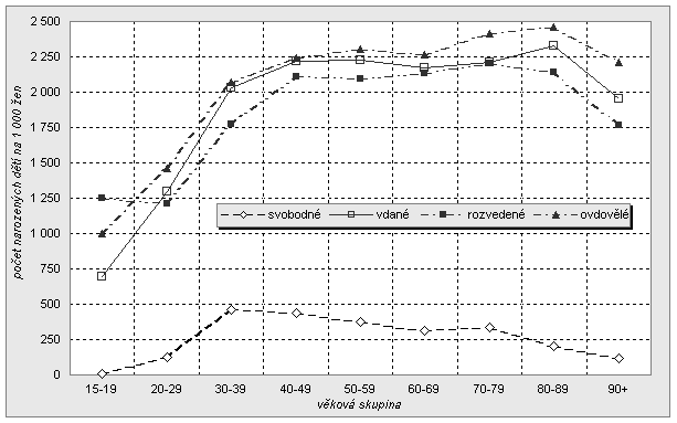Výrazná diferenciace plodnosti žen v členění podle věku a rodinného stavu je patrná rovněž z hodnot poměrového ukazatele počet dětí na 1 000 žen (viz tabulka A7 v příloze). Nejnižší relativní hodnoty jsou zcela logicky charakteristické pro mladé svobodné ženy, které jsou na počátku reprodukčního věku. Vysoká plodnost je především u vdaných či rozvedených žen patrná ve věku 45 – 49 let. Jedná se totiž nejčastěji o matky dětí narozených v sedmdesátých letech, kdy enormně vzrostla porodnost působením řady opatření v politice státu. Vůbec nejvyšší plodnost mezi ženami podle rodinného stavu a věku byla zaznamenána u ovdovělých žen v nejvyšších věkových kategoriích. Pomineme-li 2 sečtené ženy ve věku sto a více let, z nichž každé se narodily 3 děti, byl nejvyšší podíl narozených dětí na 1 000 žen v rozdělení podle pětiletých věkových skupin zjištěn u ovdovělých žen ve věku 80 – 84 let (2 502 dětí). V této skupině jsou ženy, které se nejčastěji stávaly matkami ve čtyřicátých letech minulého století. Údaje charakterizující plodnost žen z hlediska pětiletých věkových skupin a z mnoha dalších hledisek lze získat v samostatné publikaci Plodnost žen vydané v roce 2003.