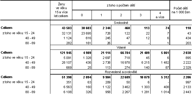 Ve struktuře žen podle rodinného stavu byl zjištěn nejvyšší podíl matek dvou dětí u vdaných (54,8 %), mezi rozvedenými ženami byl tento podíl nižší o 9 procentních bodů a u ovdovělých (bez započtení nezjištěného rodinného stavu) o 10,5 procentního bodu. Bezdětné ženy tvořily nejpočetnější skupinu u svobodných (70,2 %). Převaha bezdětných svobodných žen byla zaznamenána nejen v nejmladších věkových kategoriích (předpoklad naplnění mateřství v budoucnosti), ale také u žen, které svůj reprodukční věk již překročily. Pravděpodobnost mateřství i samotná plodnost je u svobodných tedy mnohem nižší než u ostatních žen. Podíl žen s jedním dítětem je mezi všemi kategoriemi rodinného stavu nejvyšší u rozvedených (26,0 %), přičemž vyšší než padesátiprocentní zastoupení mají rozvedené ženy s jedním dítětem ve věkové kategorii do 30 let.