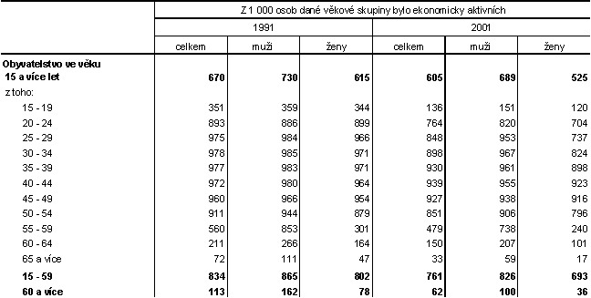 U osob šedesátiletých a starších byl pokles ekonomické aktivity ještě výraznější než u osob v produktivním věku, u mužů ze 162 na 100 a u žen ze 78 na 36 (na 1 000 osob příslušné věkové skupiny). Zvláště patrné bylo snížení ekonomické aktivity osob starších než 65 let.