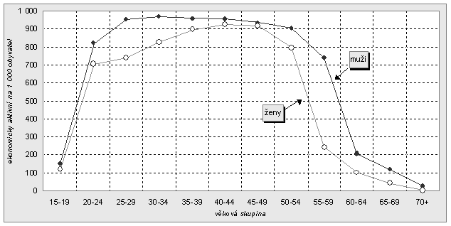 Intenzita ekonomické aktivity, vyjádřená počtem ekonomicky aktivních na 1 000 obyvatel příslušné věkové skupiny, poklesla u mužů ve věku 15 – 59 let z 865 v roce 1991 na 826 v roce 2001. Nejvyšší ekonomická aktivita mužů byla v roce 2001 ve věkové kategorii 30 – 34 let (967 na 1 000 mužů příslušné věkové skupiny). U žen byl zaznamenán pokles ekonomické aktivity z 802 v roce 1991 na 683 v roce 2001. Nejvyšší ekonomická aktivita žen byla v roce 2001 ve věkové skupině 40 – 44 let (923 z 1 000 žen této skupiny). K poklesu ekonomické aktivity došlo v 90. letech u obou pohlaví ve všech věkových skupinách.