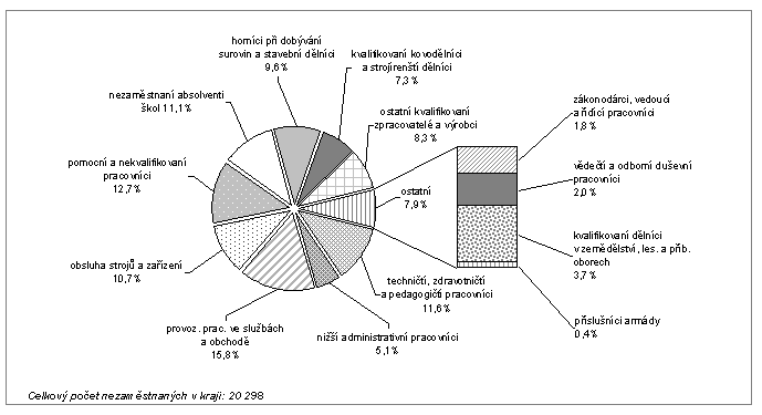 V souladu se statistickou Klasifikací zaměstnání byli v roce 2001 ekonomicky aktivní rozděleni do 10 hlavních skupin. Nejvíce byla zastoupena skupina řemeslníků, kvalifikovaných výrobců, zpracovatelů a opravářů, kteří se na všech ekonomicky aktivních podíleli téměř jednou čtvrtinou. Mezi těmito osobami bylo jen 24 % žen. Techničtí, zdravotničtí a pedagogičtí pracovníci (s maturitou) měli v roce 2001 podíl 21 %, obsluha strojů a zařízení 12 % a provozní pracovníci ve službách a obchodě 11 %. V posledně jmenované skupině dosahoval podíl žen 68 %. Vědečtí a odborní duševní pracovníci (inženýři, lékaři, učitelé) se podílem 7,4 % řadili v roce 2001 těsně před pomocné a nekvalifikované pracovníky (6,6 %). Podrobnější struktura podle tříd zaměstnání je uvedena v tabulce A11 v příloze.