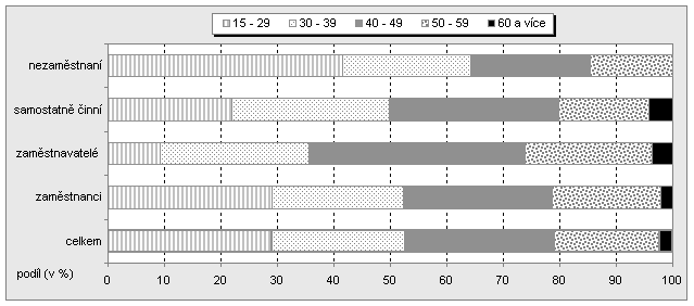 Z hlediska věku patří nejvíce zaměstnanců do skupiny 25 – 29 let, zaměstnavatelů do skupiny 45 – 49 let a samostatně činných do skupiny 45 – 49 let. Mezi členy produkčních družstev je nejpočetnější kategorií skupina 50 – 54 let a mezi pomáhajícími rodinnými příslušníky věková skupina 40 – 44 let.
