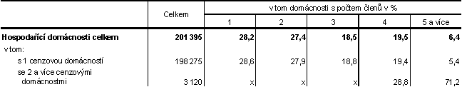 V návaznosti na stále rostoucí zastoupení samostatně hospodařících cenzových domácností, především pak domácností jednotlivců, klesá i průměrná velikost hospodařících domácností. K poklesu průměrného počtu členů připadajících na jednu hospodařící domácnost od minulého sčítání ze 2,72 na 2,51 přispělo snížení tohoto počtu v hospodařících domácnostech tvořených jednou cenzovou domácností (ze 2,67 na 2,46). U hospodařících domácností tvořených dvěma a více cenzovými domácnostmi naopak tento počet vzrostl ze 4,87 na 5,26.