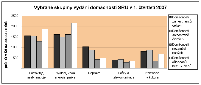 K nominálnímu i reálnému růstu výdajů došlo v prvním čtvrtletí roku 2007 oproti stejnému čtvrtletí roku 2006 u všech skupin spotřebních vydání, přičemž nejdynamičtěji (o 20,7 %) vzrostla vydání na dopravu (reálně vzhledem k poklesu cen ještě o 1,4 % více). Toto zvýšení bylo ovlivněno především četnějšími nákupy nových i ojetých automobilů v souboru SRÚ v tomto období – absolutně výdaje na nákup osobních dopravních prostředků vzrostly o částku 131 Kč na osobu a měsíc. Výrazný růst se projevil také u skupin vydání na zdraví (16,8 %) a vzdělávání (16,6 %), ten však v absolutním vyjádření představuje zvýšení pouze o 29 resp. 9 Kč za měsíc. K významnějšímu nominálnímu i reálnému růstu došlo také u skupin vydání na bytové vybavení, zařízení domácnosti (o 9,1 resp. 9,8 %) a odívání a obuv (o 8,7 resp. 11,7 %).