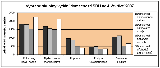Ve 4. čtvrtletí roku 2007 meziročně nominálně vzrostly výdaje ve všech skupinách spotřebních vydání kromě výdajů na dopravu, které klesly o více než 10 % nominálně a o 13,6 % reálně (na výsledcích se projevilo, že domácnosti zpravodajského souboru v tomto čtvrtletí méně nakupovaly nové i ojeté automobily). Nejvýraznější nominální i reálný růst se projevil u vydání za zdraví (o 32,6 resp. 29,7 %, v absolutním vyjádření 57 Kč na osobu a měsíc), na čemž měl podíl především nárůst částek, které domácnosti zaplatily za léky na předpis. Výrazný nominální i reálný růst zaznamenala také vydání na rekreaci a kulturu, bytové vybavení a zařízení domácnosti, stravování a ubytování. Mírnější nominální růst sice zaznamenala vydání za pošty a telekomunikace, ale ten díky poklesu cen v reálném vyjádření znamenal zvýšení o více než 6 %, k čemuž přispělo především větší využívání mobilních telefonních služeb a internetu. Vydání za potraviny a nealkoholické nápoje, alkoholické nápoje a tabák či vydání za bydlení vč. energií sice nominálně poměrně významně vzrostla, díky prudkému růstu cen to však v reálném vyjádření znamená, že domácnosti spotřebu tohoto zboží resp. těchto služeb vlastně omezily.