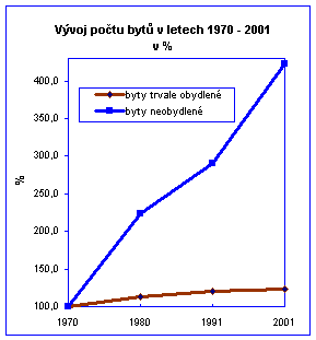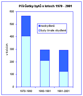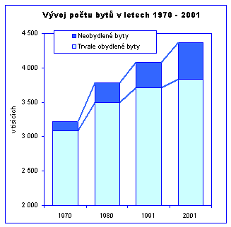 | Sčítáním v roce 1980 bylo zjištěno o 565 tisíc bytů více než v roce 1970; nová výstavba činila v tomto období 797 tisíc bytů. V období uplynulých dvaceti let (1980 - 2001) se podle výsledků sčítání zvýšil počet bytů v každém desetiletí vždy zhruba o 300 tisíc. Přitom v období 1980-1991 bylo postaveno 514 tisíc bytů, v období 1991 – 2001 pouze 243 tisíc bytů. Dlouhodobý pohled na vývoj počtu bytů ukazuje, že výrazně narůstal především počet neobydlených bytů. Ty se ze 128 tisíc bytů v roce 1970 rozšířily za třicet let na více než 540 tisíc v roce 2001. Na celkovém přírůstku bytů, který v období 1991 - 2001 činil 292 tisíc bytů se přírůstek bytů neobydlených podílí 169 tisíci. Za tímto počtem se skrývají především přesuny trvale obydlených bytů do neobydlených, neboť ty nemají přirozený zdroj přírůstku jako trvale obydlené byty (novou bytovou výstavbu). | ![]() |
