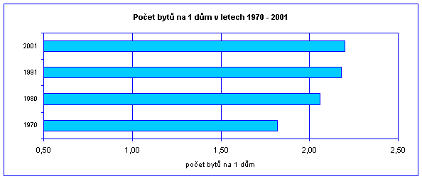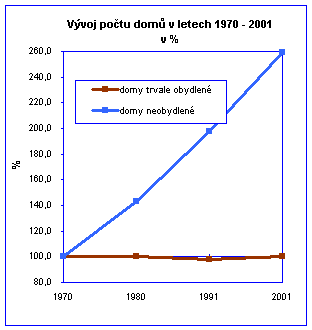 | Vzhledem k jednoznačné převaze rodinných domů ve skladbě domovního fondu v ČR (z celkového počtu trvale obydlených domů tvoří rodinné domy 85,6%), vzrůstal v uvedeném období rovněž počet domů určených k bydlení. Počet neobydlených domů se rovněž trvale zvyšoval, i když ne tak výrazným tempem jako v případě bytů. Paradoxně největší přírůstek domů byl zaznamenán v devadesátých letech. Jedním z důvodů je skutečnost, že v těchto letech se výrazně snížila výstavba velkých panelových domů a více se stavělo domů rodinných. Souvisí s tím i vývoj ukazatele počtu bytů na jeden dům. Zatímco v roce 1970 připadalo na jeden dům v průměru jen 1,82 bytu, v roce 1991 to bylo již 2,18, ale v roce 2001 se tento ukazatel zvýšil jen nepatrně – na 2,20 bytu. Za pozornost také stojí skutečnost, že počet domů trvale obydlených byl v roce 2001 téměř shodný s rokem 1970, avšak ve stejném počtu domů bydlí nyní o téměř půl miliónu osob více. | ![]() |
