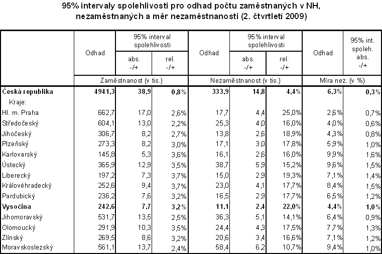 Pro všechny charakteristiky výběrového šetření je možné konstruovat 95% interval spolehlivosti, tedy interval, v němž s 95% pravděpodobností leží skutečná hodnota odhadované charakteristiky. Například skutečná hodnota míry nezaměstnanosti v ČR ležela při odhadu 6,3 % s 95 % pravděpodobností v intervalu ± 0,3 %. Velikost intervalu je ovlivněna jak četností zjišťované charakteristiky v rámci jednotlivých krajů, tak i velikostí výběrového souboru v rámci kraje. V uvedeném období odhadovaná míra nezaměstnanosti v hlavním městě Praze 2,6 % ležela s 95% spolehlivostí v intervalu ± 0,7 %. V kraji s nejvyšším odhadem míry nezaměstnanosti – Karlovarském (9,9 %) byl 95% interval spolehlivosti ± 1,6 %. Velikost intervalu spolehlivosti pro odhad základních charakteristik je zřejmá z následující tabulky.