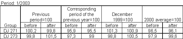 Implementation of new Czech statistical classification of products by activity (CZ-CPA), valid since 1st January 2003 has caused changes in some groups’ indices, shown in the following table. In the column „before“ are given indices calculated by CZ-CPA valid until the end of the year 2002 and in the column „after“ are given indices calculated by CZ-CPA valid since the beginning of the year 2003.