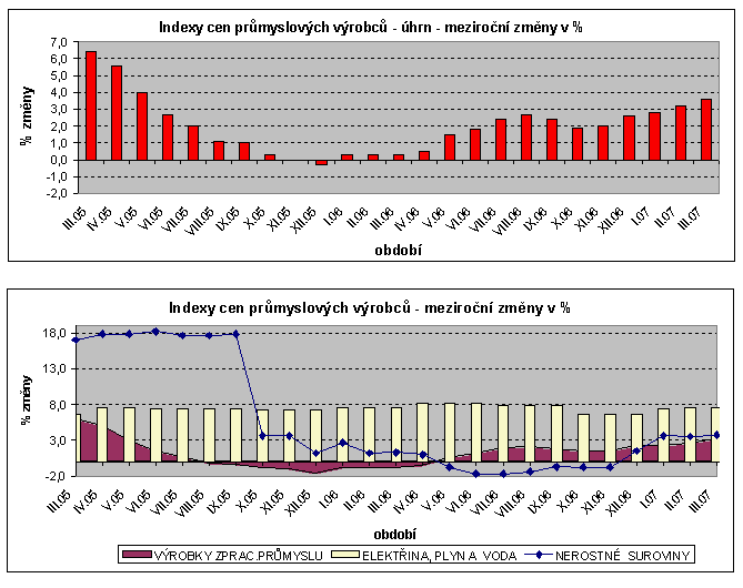V březnu 2007 byly ceny průmyslových výrobců meziročně vyšší o 3,6 % (v únoru o 3,2 %). Cenovou hladinu nadále významně zvyšovaly především ceny v odvětví základních kovů, hutních a kovodělných výrobků o 8,6 % (v únoru o 7,9 %) a ceny elektřiny, plynu a vody o 7,5 % (stejně jako v únoru). Mírně se zrychlilo tempo růstu cen potravinářských výrobků, nápojů a tabákových výrobků na 1,9 % (z 1,7 % v únoru).