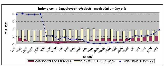 Ceny průmyslových výrobců se v květnu meziročně zvýšily o 4,1 % (v dubnu o 3,7 %), což je nejvyšší meziroční nárůst od dubna 2005. Významně vzrostly ceny v odvětvích základních kovů, hutních a kovodělných výrobků o 8,4 % (v dubnu o 8,2 %).Ceny elektřiny, plynu a vody stouply o 7,2 % (shodně jako v dubnu).