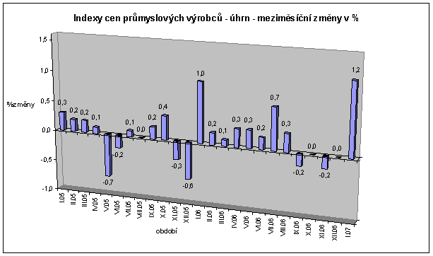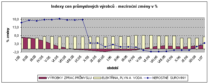 V lednu 2007 se ceny průmyslových výrobců meziměsíčně v úhrnu zvýšily o 1,2 % (největší změna od října roku 2000). Výrazněji stouply ceny v odvětví elektřiny, plynu a vody o 7,5 % (z toho elektřina včetně rozvodu o 9,2 %, tepelná energie o 3,0 % a voda o 6,6 %) a také ceny uhlí, lignitu a rašeliny o 6,5 %.