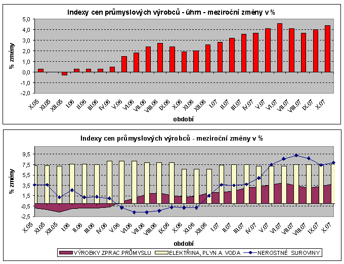 Ceny průmyslových výrobců se v říjnu 2007 oproti stejnému období předchozího roku zvýšily o 4,4 % (v září o 4,0 %).