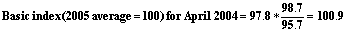 (1)Example calculation of the import price index (2005 average = 100) for April 2004:- original index (1999 average = 100) for April 2004: 97.8