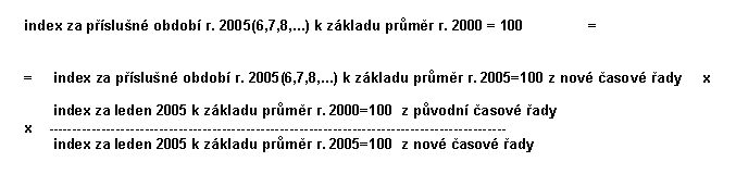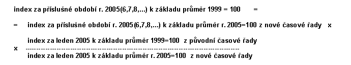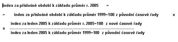Příslušné indexy původní časové řady k bazickému základu průměr 1999=100, které se vztahovaly k období 1994 – prosinec 2006 (od ledna r. 2001 do prosince r. 2006 - viz publikace „ČSÚ – Ceny“ a od 1994 do prosince r. 2000 - viz publikace „Revize 2000 - časové řady upravené koeficienty“), se převedou na nový bazický základ průměr r. 2005=100, platný od ledna r. 2007, takto: