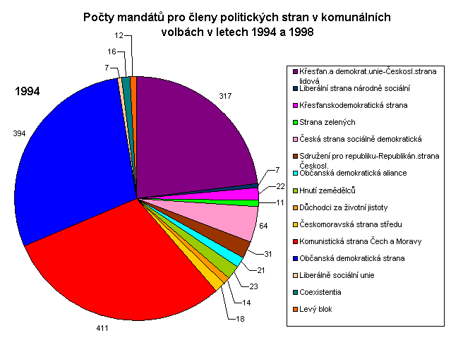 Graf 3. Počty mandátů pro členy politických stran v komunálních volbách v letech 1994 a 1998