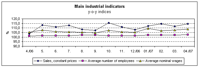 Sales from industrial activity at constant prices (of the year 2000) rose by 14.4% (+17.0% at current prices) in April 2007, or by 11.9% WDA, or by 12.8 SA, year-on-year. The increase of sales from industrial activity was most contributed to by ‘manufacture of transport equipment’ (+16.5%, contribution to the growth of industry in total 3.6 percentage points), ‘manufacture of electrical and optical equipment’ (+13.4%, contribution 2.0 p.p.), ‘manufacture of machinery and equipment’ (+25.4%, contribution 2.0 p.p.) and ‘manufacture of rubber and plastic products’ (+28.6%, contribution 1.9 p.p.).