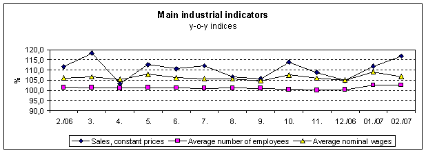 Sales from industrial activity at constant prices (of the year 2000) in February 2007 rose by 16.8% (+17.0% at current prices), or by 15.4% SA, year-on-year. The increase of sales from industrial activity was most contributed to by ‘manufacture of electrical and optical equipment’ (+37.6%, contribution to the growth of industry in total 5.3 percentage points), ‘manufacture of transport equipment’ (+16.4%, contribution 3.7 p.p.) and ‘manufacture of machinery and equipment’ (+26.1%, contribution 1.9 p.p.). Sales from industrial activity decreased in ‘electricity, gas and water supply’ (-8.2%, contribution -0.6 p.p.), ‘mining and quarrying of energy producing materials’ (-2.7%, contribution -0.05 p.p.) and ‘manufacture of leather and leather products’ (-7.6%, contribution -0.01 p.p.).