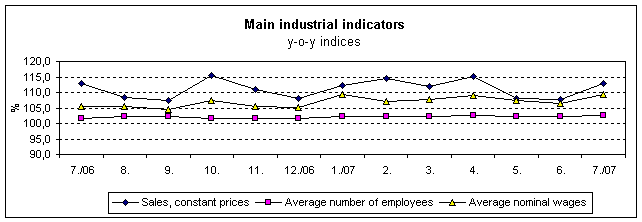 Sales from industrial activity at constant prices (of the year 2000) in July 2007 rose by 13.0% (+15.8% at current prices), by 10.4% WDA, or, identically, by 10.4% SA, year-on-year. The increase of sales from industrial activity was most contributed to by ‘manufacture of transport equipment’ (+18.7%, contribution to the growth of industry in total 4.0 percentage points), ‘manufacture of electrical and optical equipment’ (+17.2%, contribution 2.6 p.p.) and ‘manufacture of machinery and equipment’ (+22.2%, contribution 1.7 p.p.). Sales from industrial activity decreased in 'mining and quarrying of energy producing materials' (-8.7%, contribution -0.1 p.p.), 'mining and quarrying except energy producing materials' (-6.4%, contribution -0.04 p.p.) and 'manufacture of coke, refined petroleum products' (-1.7%, contribution -0.04 p.p.).