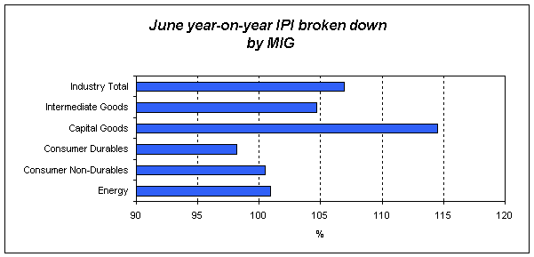 The June year-on-year IPI broken down by main industrial grouping increased most in the grouping for ‘Capital Goods’ (+14.5%).