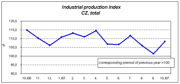 Industrial production in October 2007 grew by 8.4% year-on-year and by 13.3% month-on-month. Compared with the average month of the base year 2000, industrial production in October 2007 was by 77.8% higher. Year-on-year saw October higher industrial production in sections: D – ‘Manufacturing‘ (+8.8%) and E – ‘Electricity, gas and water supply’ (+7.2%), while in section C – ‘Mining and quarrying’ dropped (–2.1%).