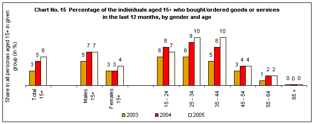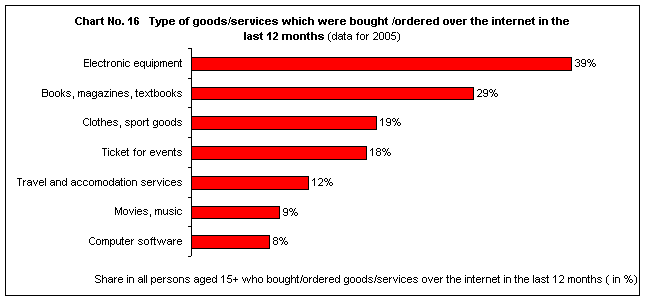 VI.1. Internet commerce – purchases over the internet6% of population aged 15+ bought/ordered goods or services over the internet in the last 12 months (the survey was carried out in the 1st quarter 2005).