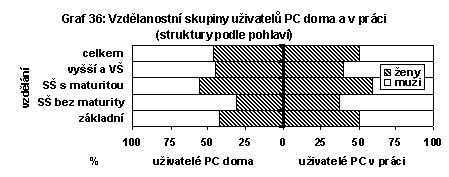 Mezi ženami, které použily počítač v posledních třech měsících, převládala skupina středoškolaček s maturitou – a to jak v případě těch, které použily počítač v práci tak i ve skupině těch, které ho použily doma. A to byly jediné dva případy, kdy podíly ve vzdělanostní struktuře byly ve prospěch žen (v případě uživatelů doma to bylo o 16,2 procentních bodů, v případě uživatelů PC v práci byl rozdíl ve prospěch žen dokonce 19,4 bodů). V ostatních případech vždy – jak mezi uživateli PC doma tak mezi těmi, kteří v posledním čtvrtletí pracovali s počítačem v práci – byly rozdíly procentních bodů ve prospěch mužů. Největší rozdíl v prospěch mužů pak byl mezi uživateli v práci s vyšším a vysokoškolským vzděláním, kde to bylo 12,2 procentních bodů. Při porovnání se vzdělanostní strukturou populace ČR se ukazuje, že vzdělanostní skladby uživatelů PC doma se od celkového rozložení v populaci příliš neliší, rozdíly však jsou markantní v případě uživatelů PC v práci. Je vidět vliv skutečnosti, že zejména mezi ženami je obecně vysoké zastoupení středoškolaček s maturitou, které často při svém zaměstnání využívají PC a právě mezi uživatelkami počítače v práci je jejich zastoupení bezkonkurenčně nejvyšší.