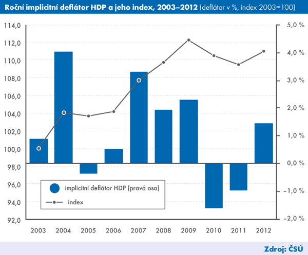 Index spotřebitelských cen sleduje vývoj cen spotřebního zboží a služeb. Vychází z předem definovaného spotřebního koše s vybranými produkty, jejichž váha je konkrétně určena. V letech 2003 až 2012 rostly roční hodnoty CPI prakticky neustále, průměrné tempo bylo 2,4 %. V hodnotách meziročních změn CPI lze vypozorovat určité intervaly. Období 2003–2008 lze označit za „periodu zvyšování temp růstu CPI“. Maximální hodnoty tempo dosáhlo v roce 2008 (6,4 %). Podíl na uvedeném vývoji měla vysoká výkonnost ekonomiky, která se projevovala růstem nominálních mezd a poklesem nezaměstnanosti. To následně ústilo ve vyšší poptávku po spotřebních produktech. V roce 2008 k růstu cen přispělo i zvýšení daně z přidané hodnoty. Konkrétně došlo k růstu snížené sazby DPH z 5 % na 9 %. V roce 2009 poklesla změna CPI k hodnotě 1,1 %. Důvodem byl ekonomický útlum, z něho plynoucí skokový růst nezaměstnanosti a s ním související snížení kupní síly spotřebitelů. Od té doby až do roku 2012 nabývalo tempo růstu i přes nesnižující se nezaměstnanost znovu na intenzitě. V roce 2012 tak hodnota CPI stoupla o 3,3 %. Na postupném opětovném zvyšování spotřebitelských cen se podílel růst nominálních mezd. V období útlumu pravděpodobně docházelo k propouštění méně kvalifikované pracovní síly a průměrné mzdy tak měly tendenci růst. Vliv na růst cen mělo i další navýšení daně z přidané hodnoty o jeden procentní bod v lednu 2010 (na 20 % pro základní sazbu a 10 % pro sníženou) a podílel se na něm také nárůst snížené sazby v roce 2012 z 10 % na 14 %.