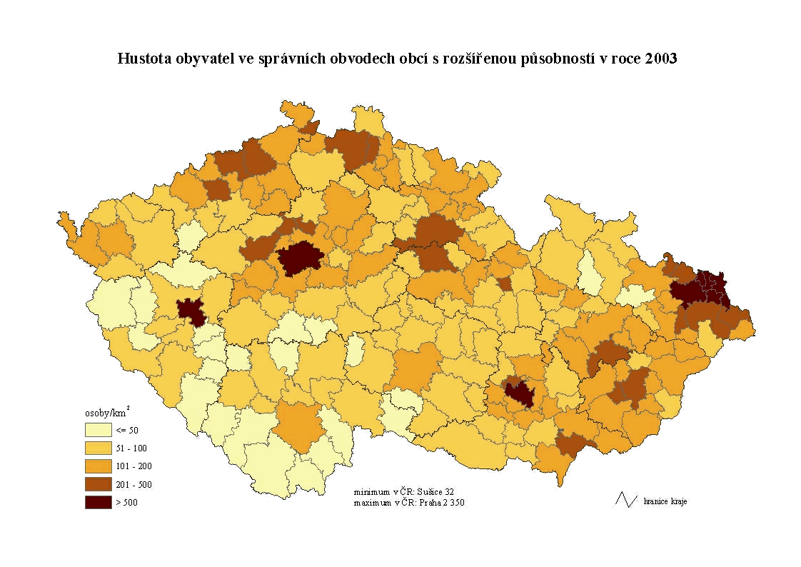 Mapa 2 Hustota obyvatel ve správních obvodech obcí s rozšířenou působností v roce 2003