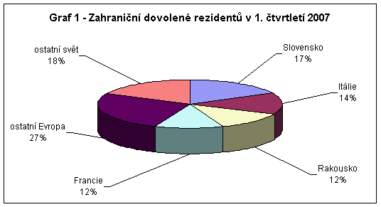 Hlavním účelem pobytu byla v 59 % případů rekreace a sport. Rezidenti dávali nejvíce přednost ubytování v hotelu a podobném zařízení (56 %) a k dopravě využívali především automobil (46 %) a leteckou přepravu (33 %). Individuální organizaci zahraniční cesty vykázalo 54 % účastníků a formou zájezdu bylo realizováno 33 % cest. Většina zahraničních dovolených směřovala v tomto čtvrtletí do států s velehorskými pásmy - na Slovensko a do Itálie, o třetí místo se dělila Francie s Rakouskem (viz. graf 1). Průměrné zahraniční výdaje činily 14 943 Kč a meziročně vzrostly o téměř 2 300 Kč.