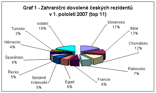 V 1. pololetí 2007 bylo uskutečněno o 31,5 % delších zahraničních pobytů více než ve stejném období předchozího roku, v absolutním vyjádření se jednalo o 1,7 mil. cest s celkovým počtem 14,5 mil. přenocování. Průměrný počet přenocování dosáhl 8,8 noci a průměrné výdaje 13 236 Kč na jednu zahraniční cestu. Mezi nejnavštěvovanější destinace patřilo podobně jako před rokem Slovensko, Itálie, Chorvatsko a Rakousko, z mimoevropských zemí se v posledních letech stále větší oblibě těší Egypt a Tunisko (viz. graf 1).