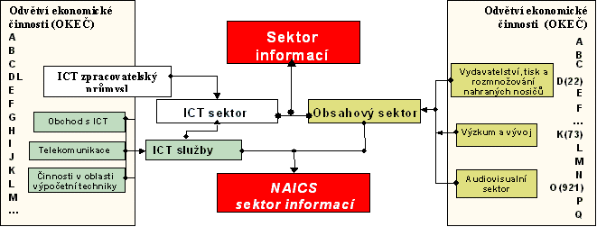 Vymezení informační sektoru vychází z platné Odvětvové klasifikace ekonomických činností (OKEČ), která je zpracována podle pravidel závazných pro vytvoření odvětvových klasifikací na mezinárodni úrovni. Při klasifikaci jednotlivých odvětvových skupin informačního sektoru se vycházelo především z doporučení Organizace pro ekonomickou spolupráci a rozvoj (OECD) pro tzv. ICT sektor, který byl doplněn o některá další odvětví především z oblasti produkující tzv. obsah (Obsahově produkční sektor) podle definic a klasifikací, která jsou používána např. ve Finsku, Francii nebo v USA. Vzhledem k dynamickému vývoji celé informační společnosti a jisté zastaralosti stávajících klasifikací, a tim neexistenci spolehlivých dat v požadovaném členěni bylo nutné v některých případech použít data v méně než požadované úrovni OKEČ pro Informační sektor. Data za celý informační sektor, stejně jako za jeho dvě hlavní části ( ICT sektor a Obsahově produkční sektor) jsou v této publikaci založeny na rozšířené definici.