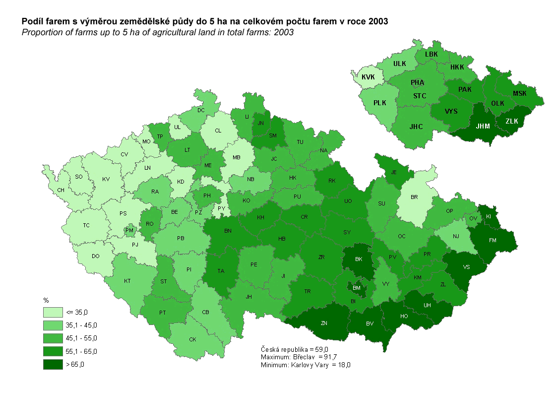 14. Podíl farem s výměrou zemědělské půdy do 5 ha na celkovém počtu farem v roce 2003