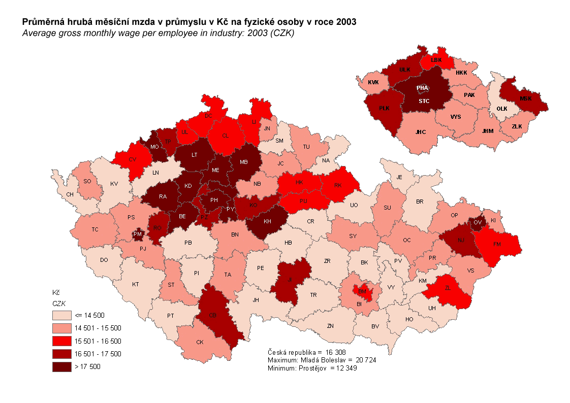 16. Průměrná hrubá měsíční mzda v průmyslu v Kč na fyzické osoby v roce 2003
