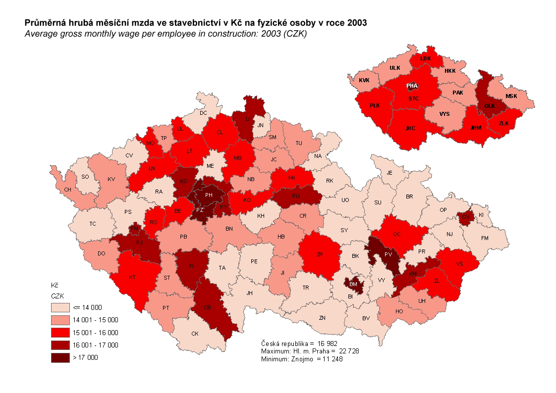 18. Průměrná hrubá měsíční mzda ve stavebnictví v Kč na fyzické osoby v roce 2003