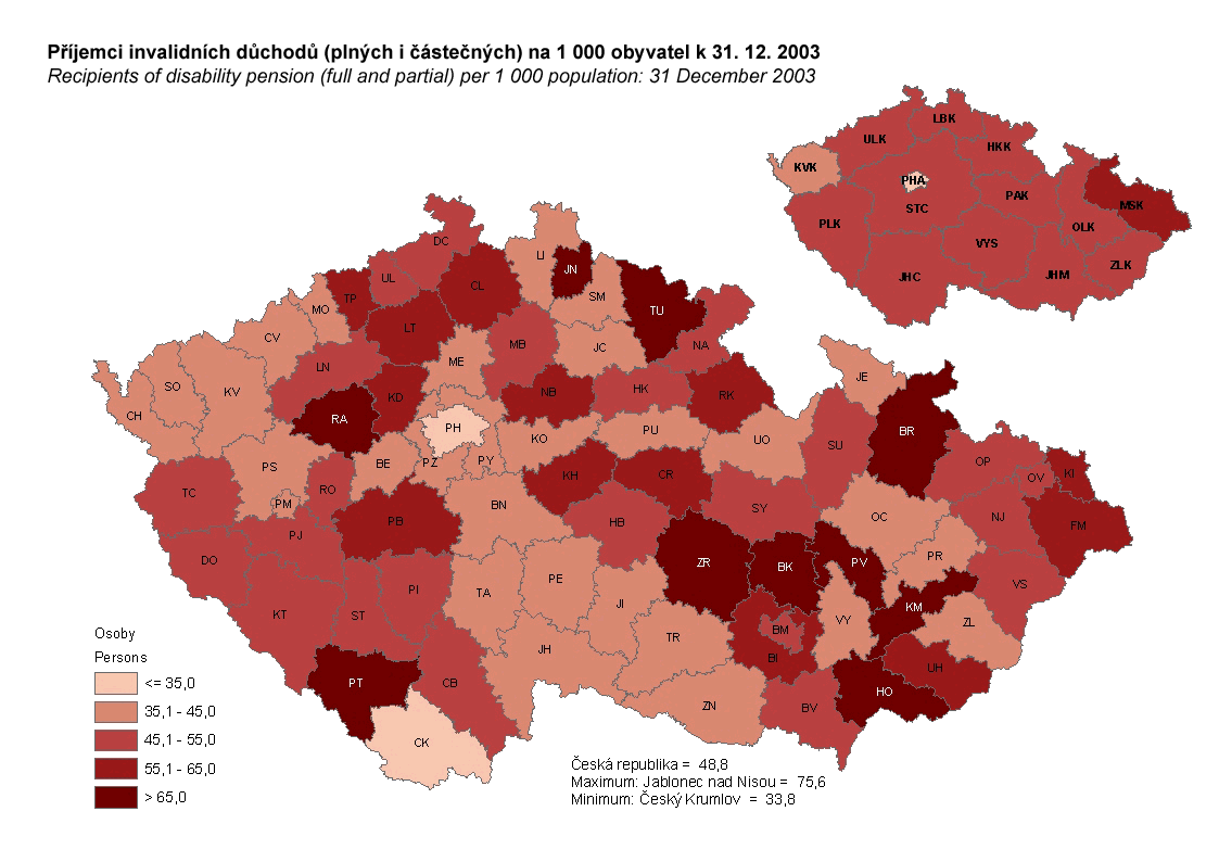 29. Příjemci invalidních důchodů (plných i částečných) na 1 000 obyvatel k 31. 12. 2003
